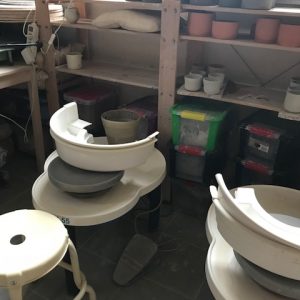 - un tour + un tabouret. En ce qui concerne la hauteur et le type de tabouret à choisir, il y a autant de version que de potiers ! A l’atelier, je travaille avec des tabourets dont la hauteur de l’assise est 10cm plus basse que la girelle (= la partie qui tourne sur le tour !). J’ai récemment changé les tabourets pour le modèle ci-joint: (http://www.ikea.com/be/fr/catalog/products/80308393/). Je crois qu’ils vont tenir des années car ils sont bien costaux, la barre du bas qui fait le tour des pieds est bien pratique pour caller mon pied gauche quand je tourne, mais aussi car elle renforce la stabilité des pieds (la partie mise à rude épreuve lorsque l’on tourne).