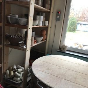 - une table pour travailler les hanses, décors, modelage, malaxer la terre … (elle doit faire au min. 60x60cm, mais ce n’est pas très grand !). Une table, ce n’est jamais trop grand, vous trouverez toujours de quoi la remplir 😉 Les tréteaux, ne sont pas conseillés, il vous faut une table bien solide, vous allez lancer, frapper, triturer votre terre dessus… si elle n’est pas bien stable et/ou trop légère, vous allez mettre vos nerfs à rude épreuve 😉