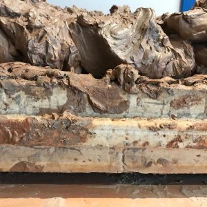 La terre doit pouvoir se « décoller » aisément de votre plâtre. Les extrémités séchant plus rapidement que le centre de votre plaque de terre, vous pouvez former des petits ‘ponts’ en terre dés que celle-ci est assez ferme, le séchage en est plus uniforme. L’objectif est de récupérer une consistance identique à celle d’un nouveau pain d’argile.