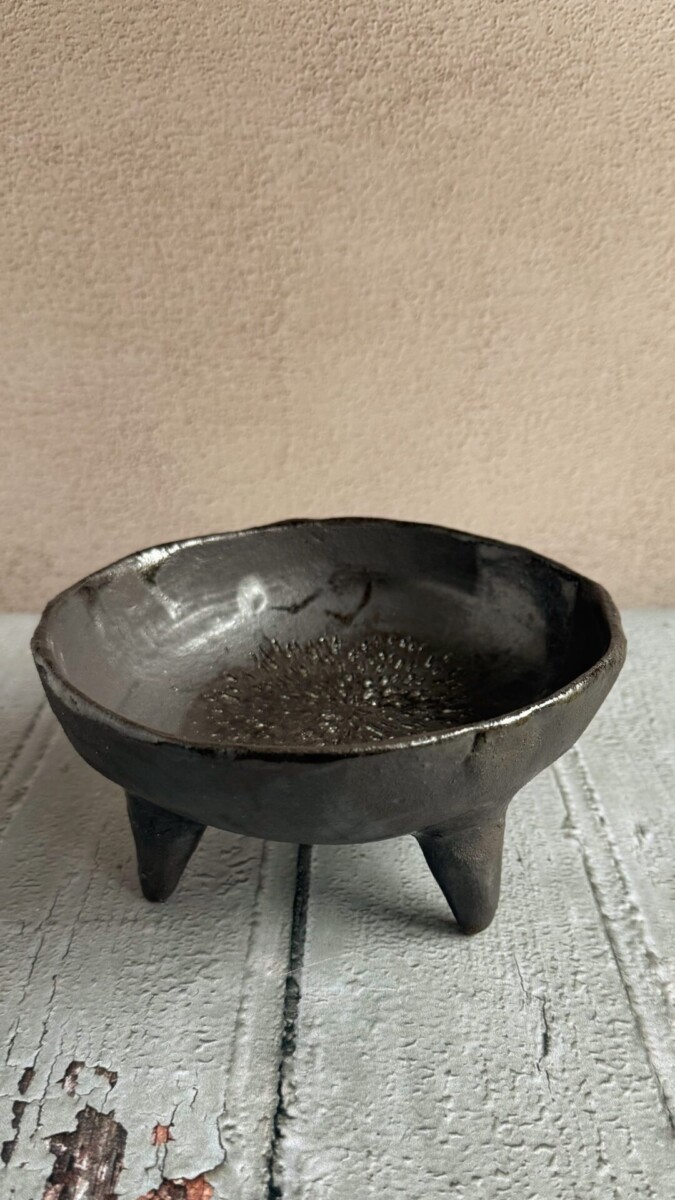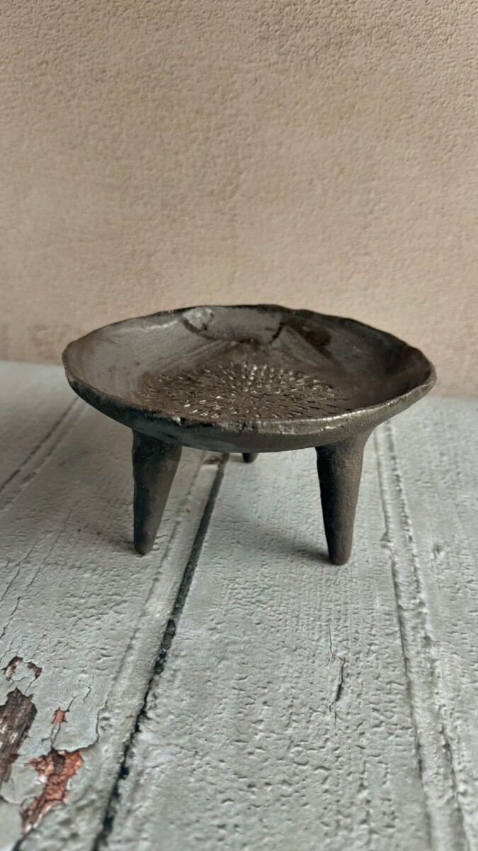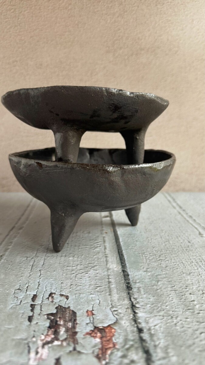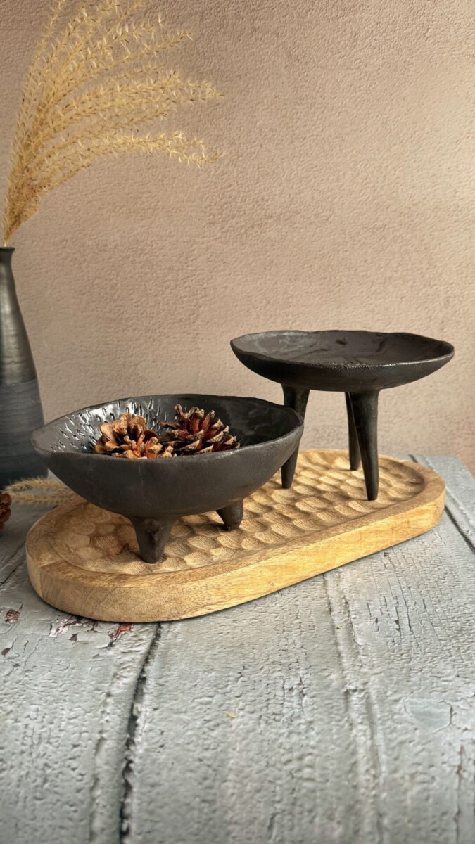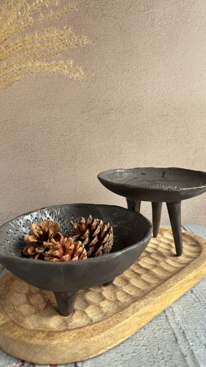 Ces deux plats, chacun posé sur trois pieds élégants, forment un ensemble harmonieux où se rencontrent équilibre, hauteur et matière brute.