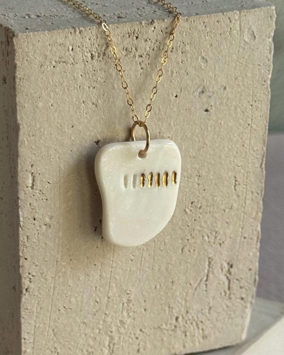 Ce pendentif fait partie d’une série de bijoux façonnés à la main en porcelaine dans mon atelier Ose la Terre à Braine-l’Alleud.